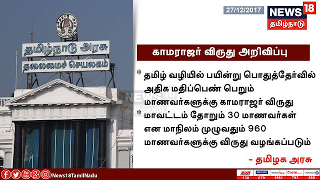 மாவட்டம் தோறும் 30 மாணவர்களை தேர்ந்தெடுத்து தமிழகம் முழுவதும் 960 மாணவர்களுக்கு காமராஜர் விருது அளிக்கப்படும் என தமிழக அரசு அறிவிப்பு
