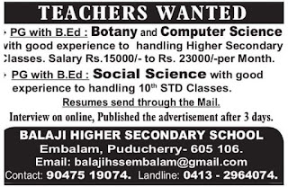 PG with B.Ed : Botany and Computer Science vith good experience to handling Higher Secondary Classes . Salary Rs.15000 / - to Rs . 23000 / -per Month .PG with B.Ed : Social Science with good experience to handling 10th STD Classes .