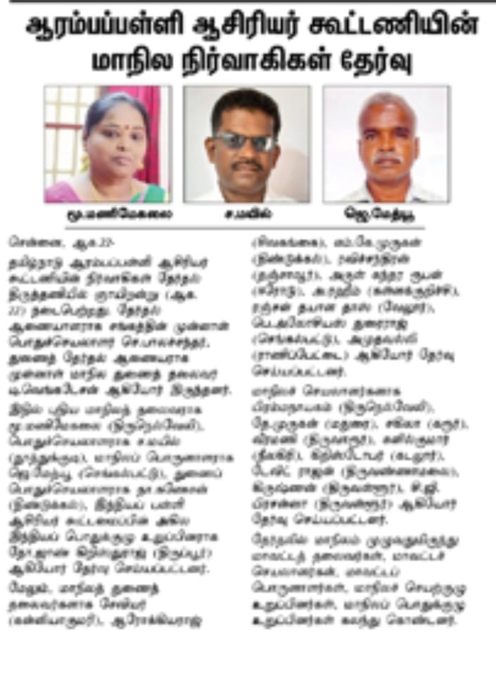 கூட்டத்தில் மாநிலத் தலைவராக மூ.மணிமேகலை (திருநெல்வேலி), பொதுச்செயலாளராக ச.மயில் (தூத்துக்குடி), மாநிலப் பொருளாளராக J.மத்தேயூ (செங்கல்பட்டு), துணைப் பொதுச்செயலாளராக தா.கணேசன் (திண்டுக்கல்), இந்தியப்பள்ளி ஆசிரியர் கூட்டமைப்பின் (STFI) அகில இந்தியப் பொதுக்குழு உறுப்பினராக தோ. ஜாண் கிறிஸ்துராஜ் (திருப்பூர்) ஆகியோர் தேர்வு செய்யப்பட்டனர்.